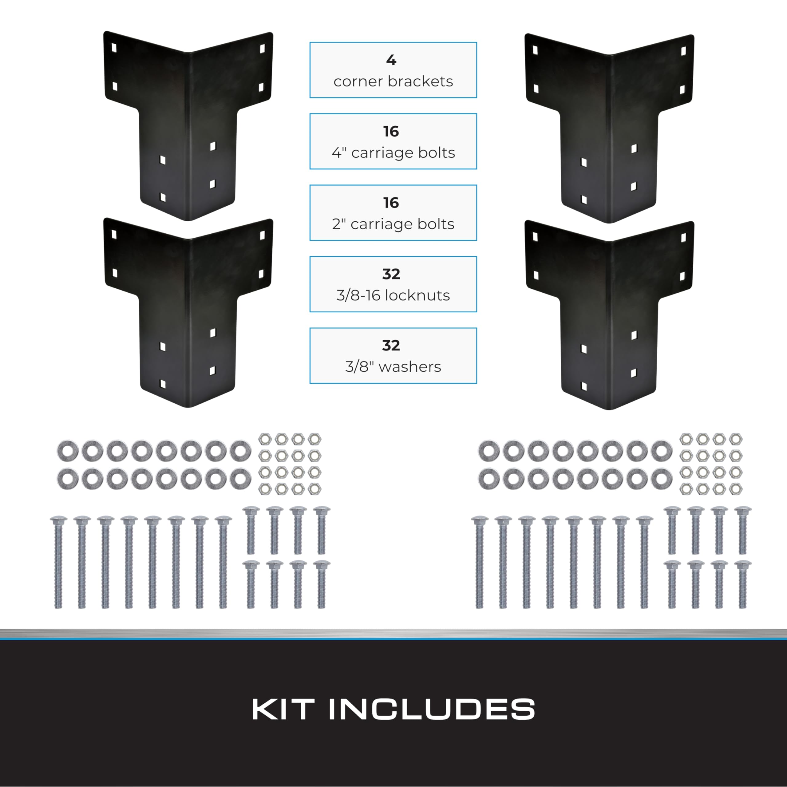 - [Black 4-Pack] – Includes 4 brackets, 16 bolts, 32 washers, and 32 locknuts—ideal for a single project.